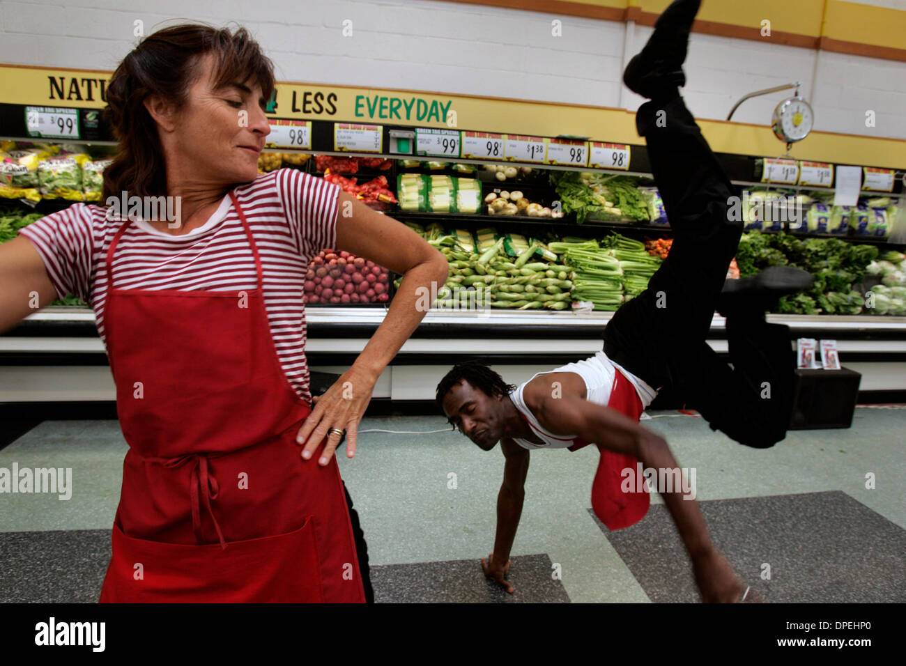 Published 10 8 2006 F 8 September 23 2006 San Diego California Usa Yvonne Harguindeguy Cq Left And Robby Johnson Perform A Duet In The Produce Section Of The Food 4 Less At The Market